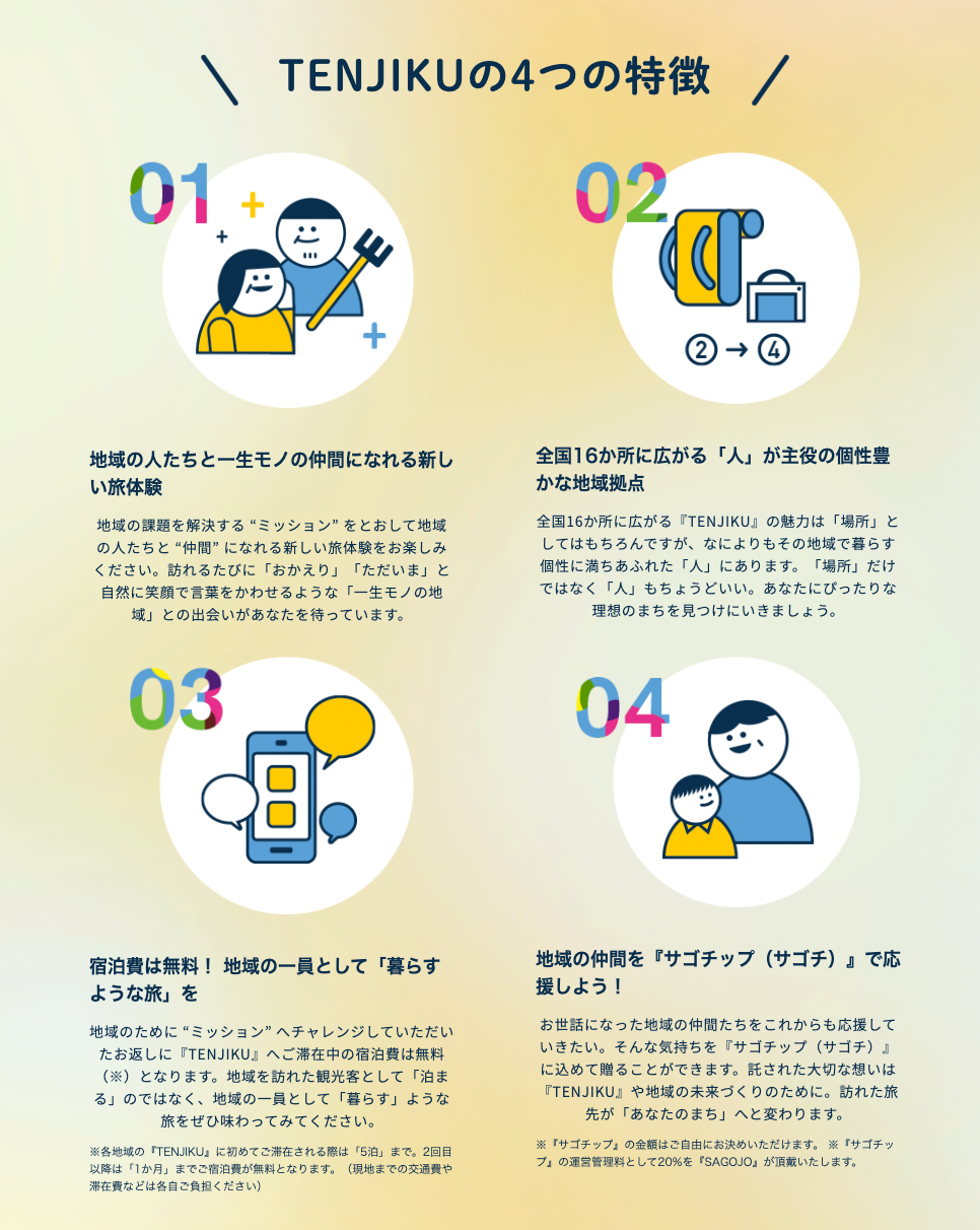 『TENJIKU(テンジク)』は、地域の課題を解決する “ミッション” をとおして、地域の人たちとより深く関わりながら “仲間” になれる新しい旅体験を届けていきます。これまでの旅ではたどりつけなかった「一生モノの地域」との出会いをお楽しみください。