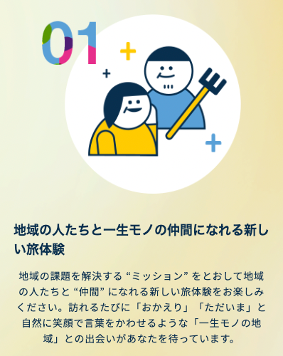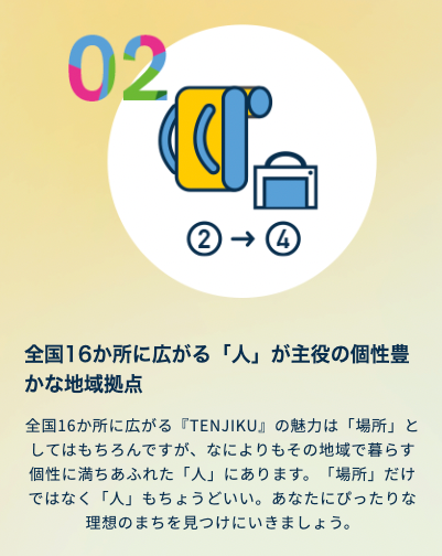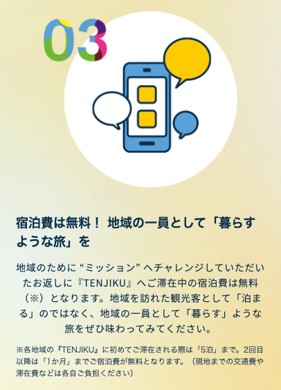 TENJIKUでは「ミッション」を通して、 地域の人々と “一生モノの仲間” になれるような新しい旅体験をお届けしていきます。TENJIKUを利用した旅人の中には、地元の方々と仲良くなって事業をはじめたり、移住や多拠点暮らし先として選んだり、という方がたくさんいます。